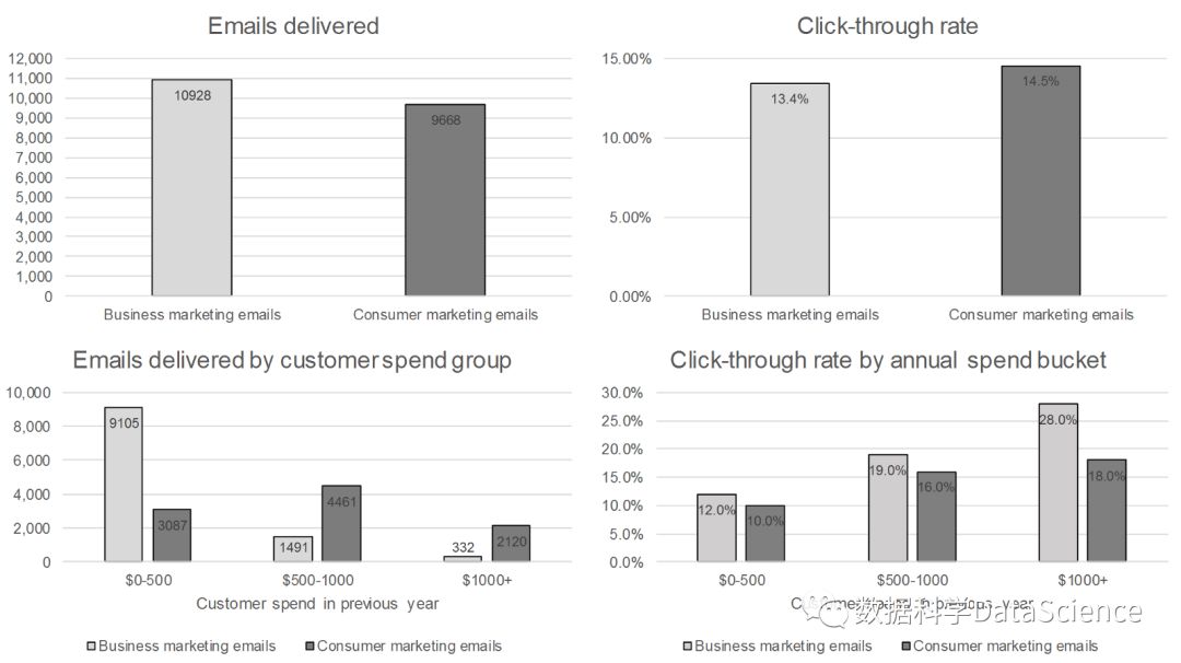 A company selling a competitor to Microsoft Office is testing their marketing by sending out two different sets of emails. One set contains business related content, and one contains consumer related content. We are interested in how each campaign performed; did one do at getting people to click-through? Below is a selection of graphs on the two email campaigns. The bottom two graphs have the same data as the top two, only bucketed by the amount the customer has spent with the company the year before the emails were sent. Which campaign did better?[来源2]