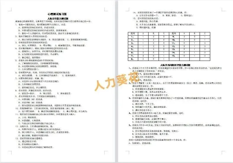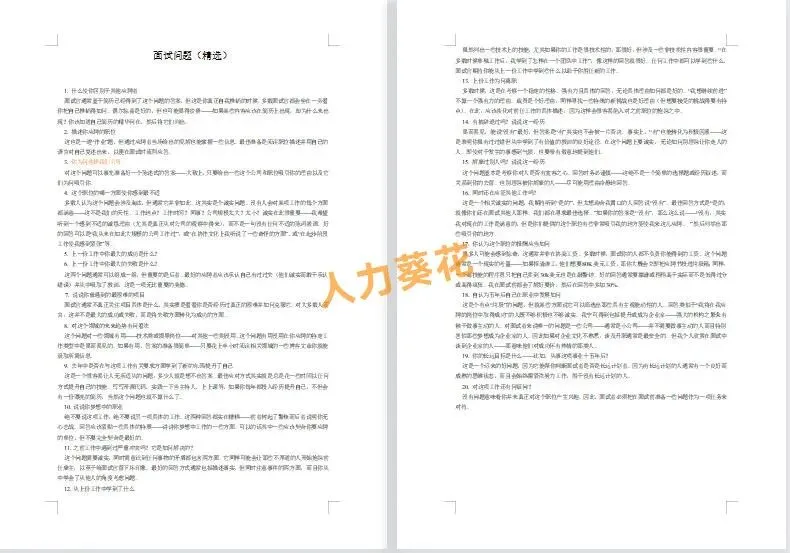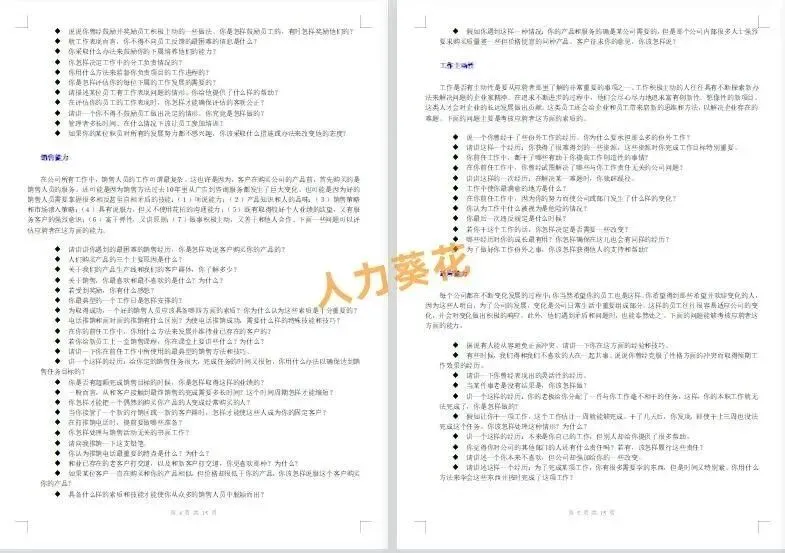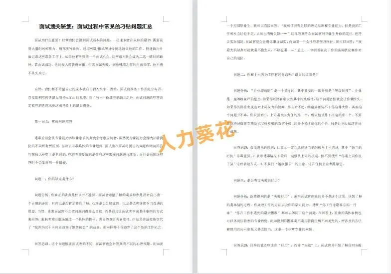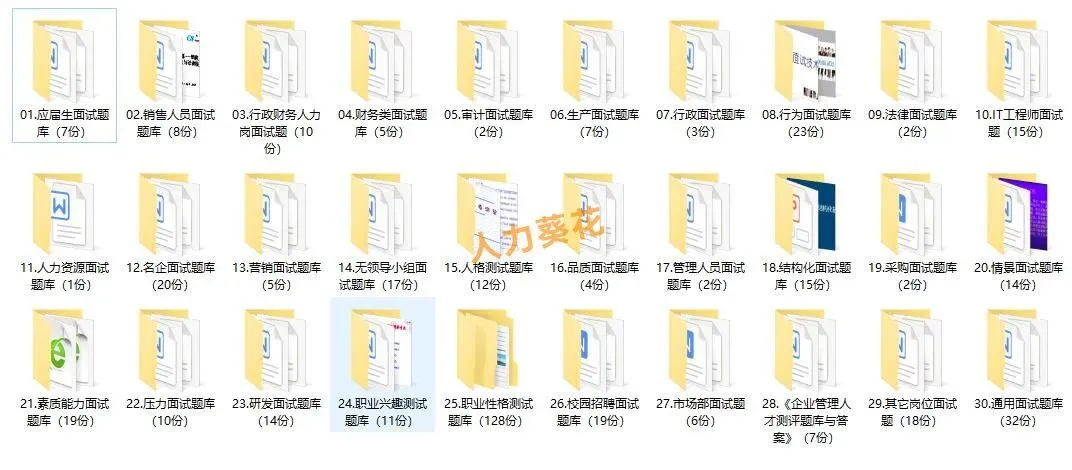 本套资料内含行政财务人力岗面试题、人格测试题库、品质面试题库、市场部面试题库、名企面试题库、通用面试题库等,一起来看下~