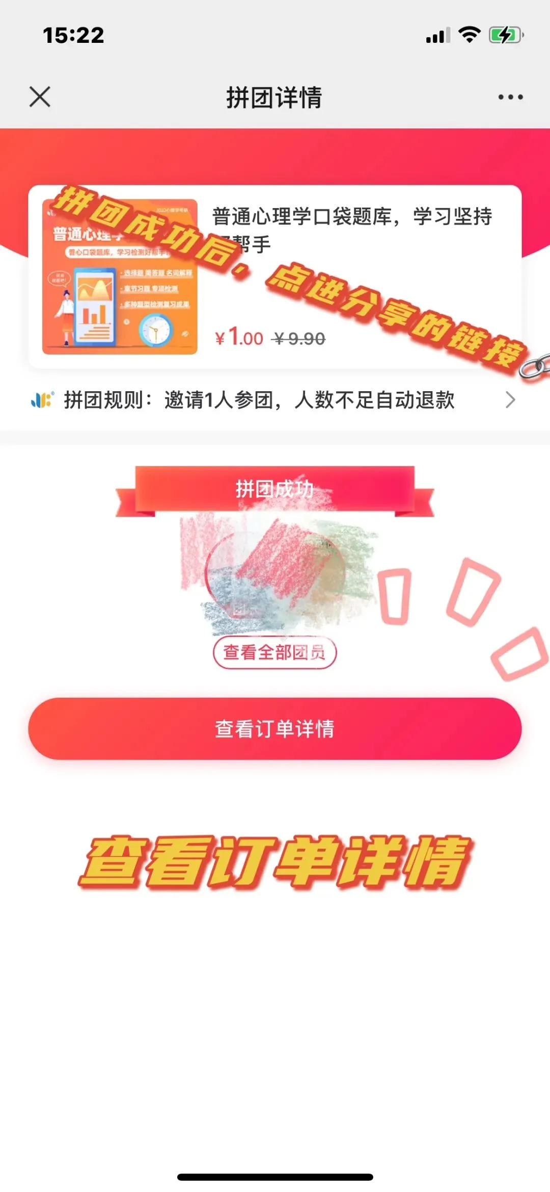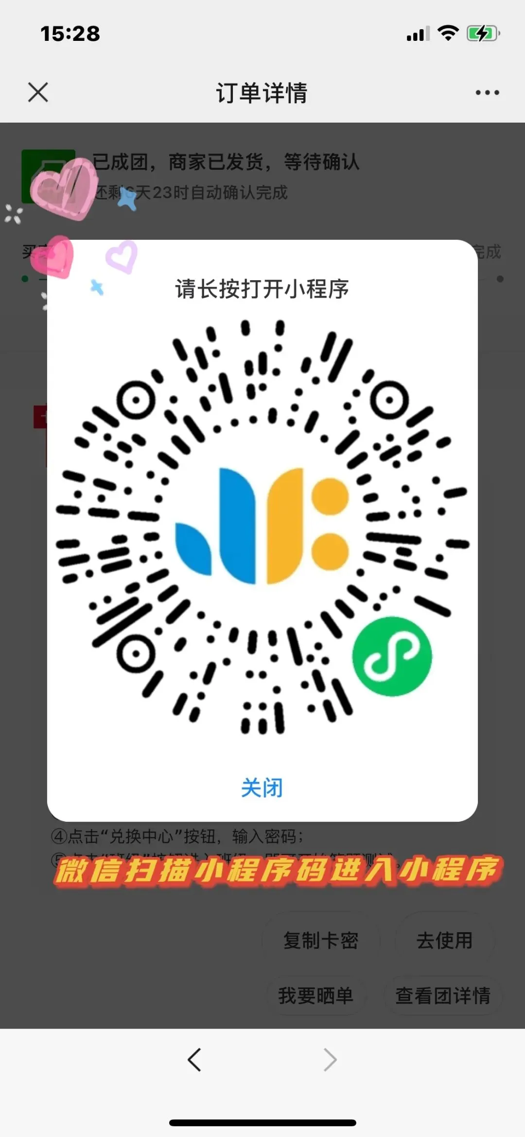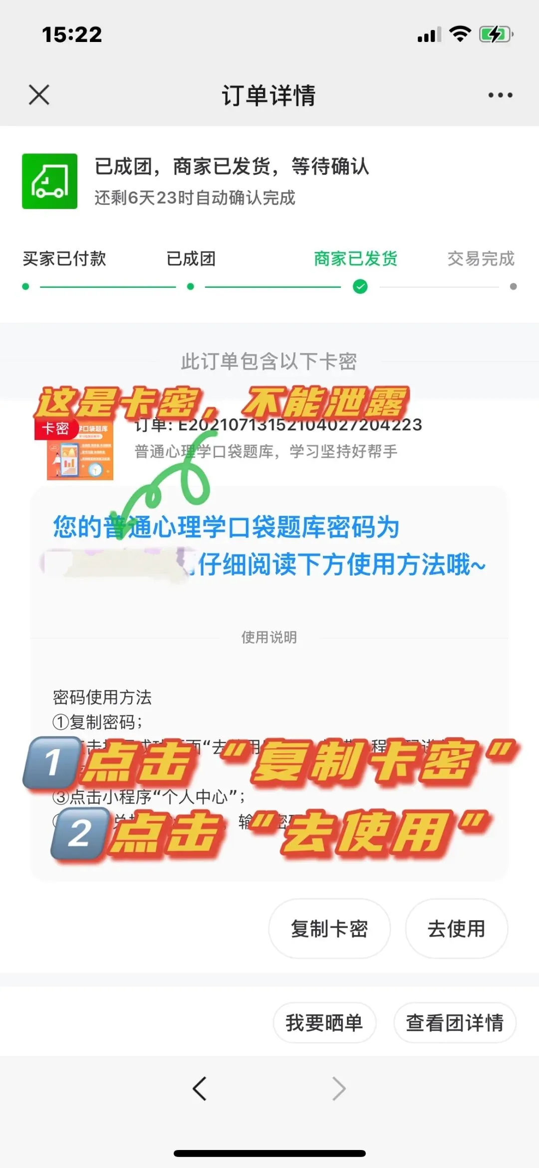 拼团成功后,点击“查看订单详情”即可找到自己的卡密。