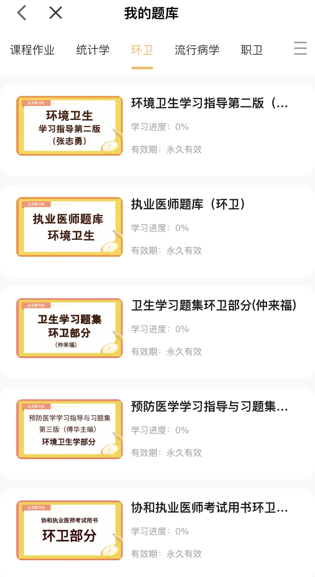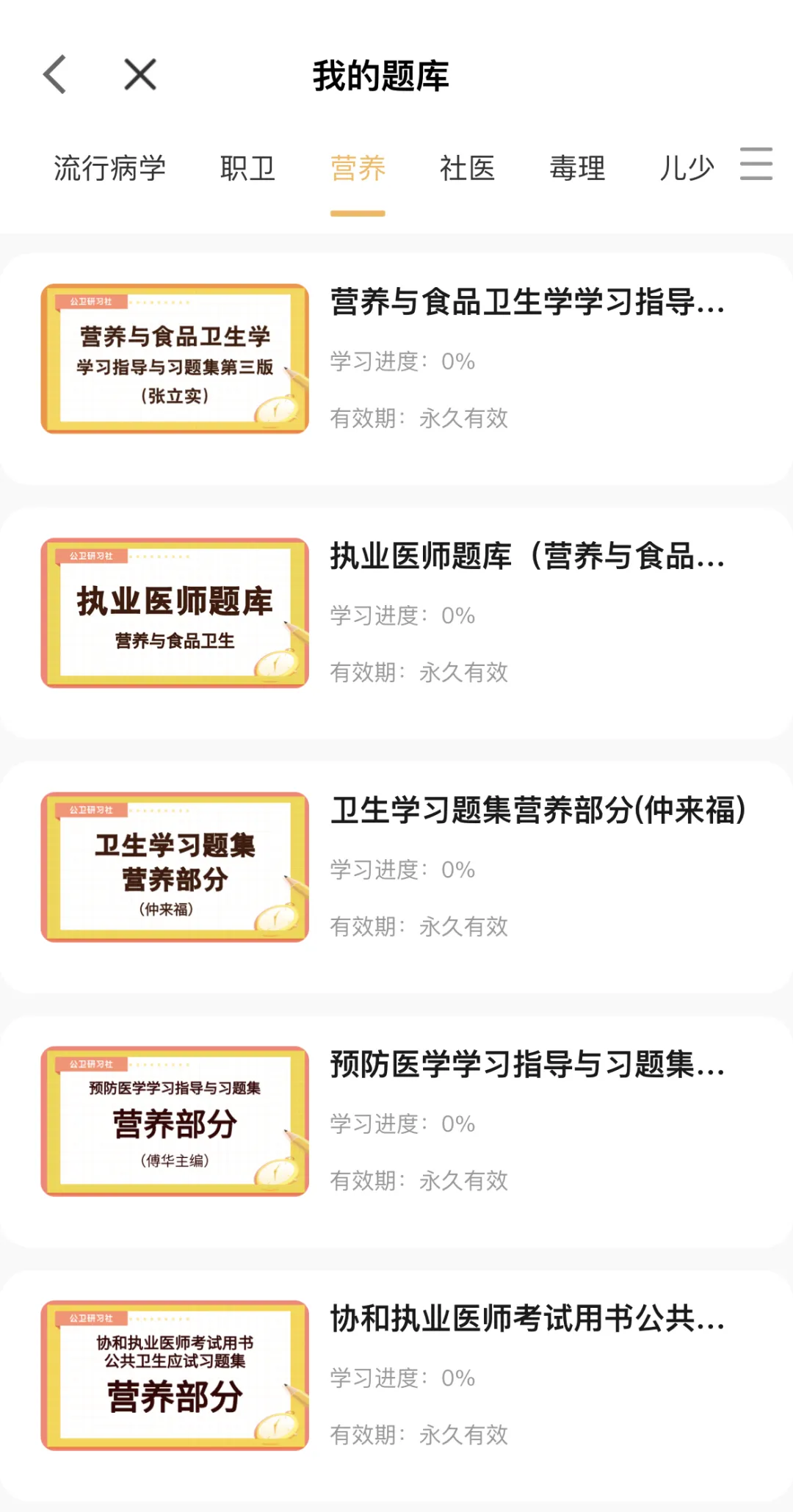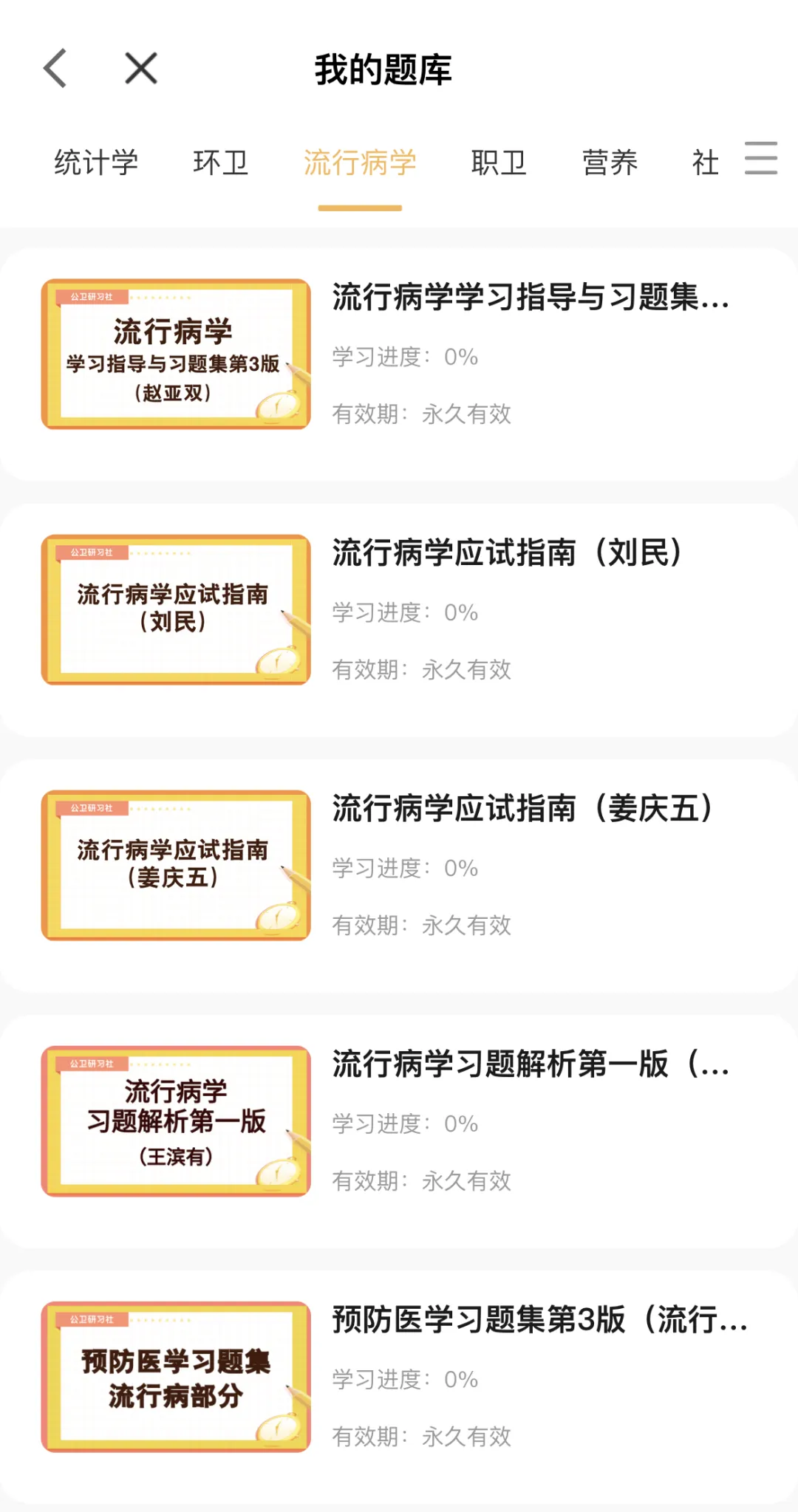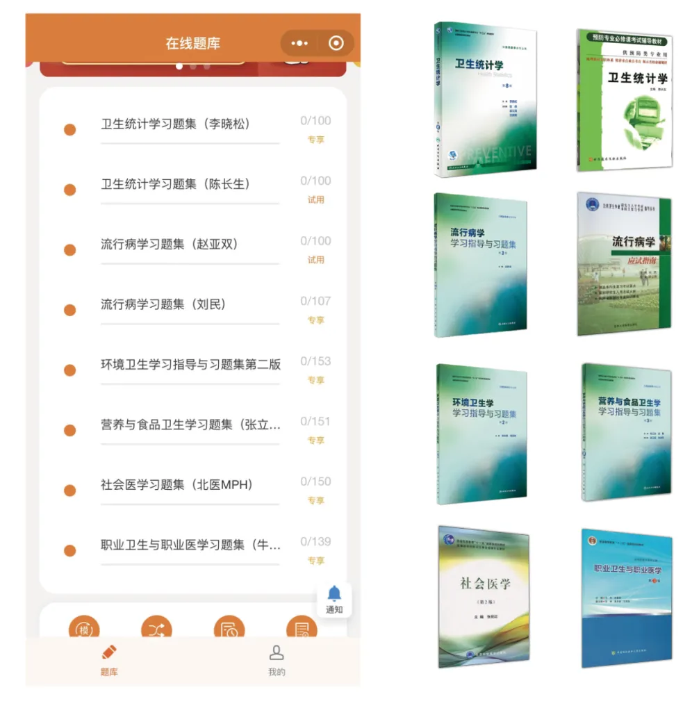 卫生统计学(李晓松版)、卫生统计学(陈长生版)、流行病学(赵亚双版)、流行病学(刘民版)环境卫生学(张志勇版)、营养与食品卫生学(张立实版)、职业卫生与职业医学(牛侨版)、社会医学(刘民版)。