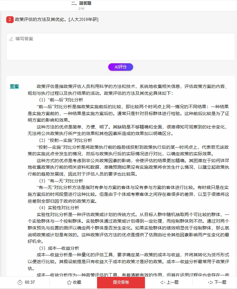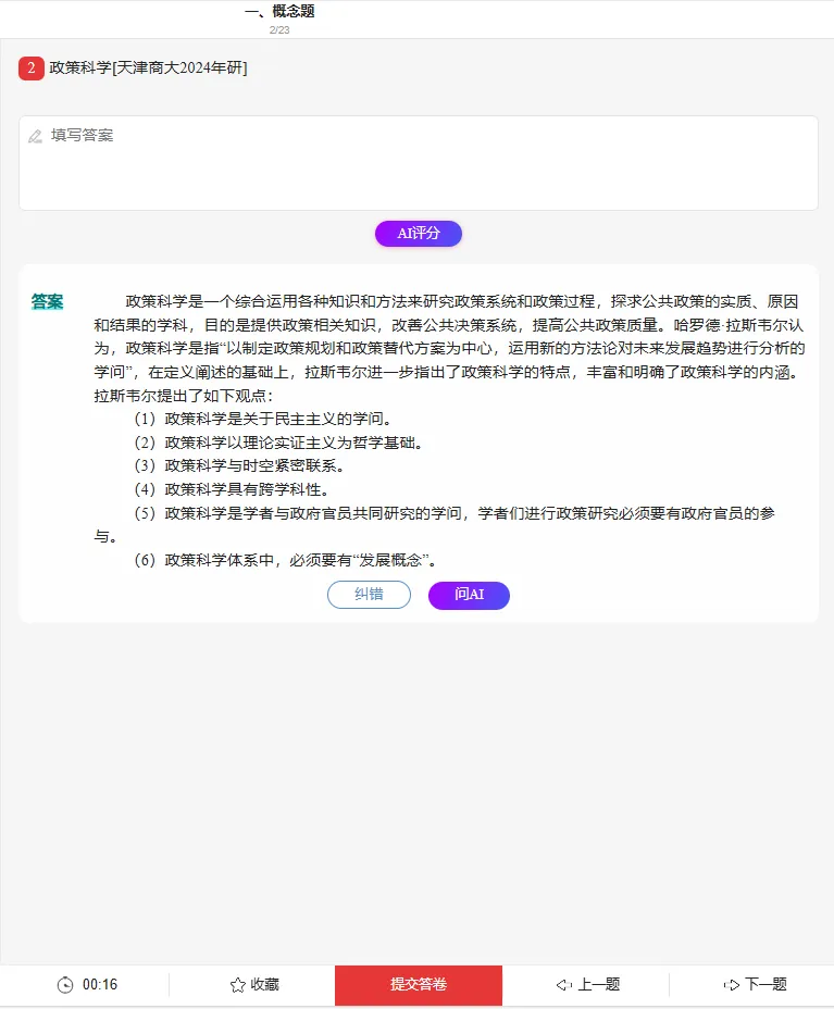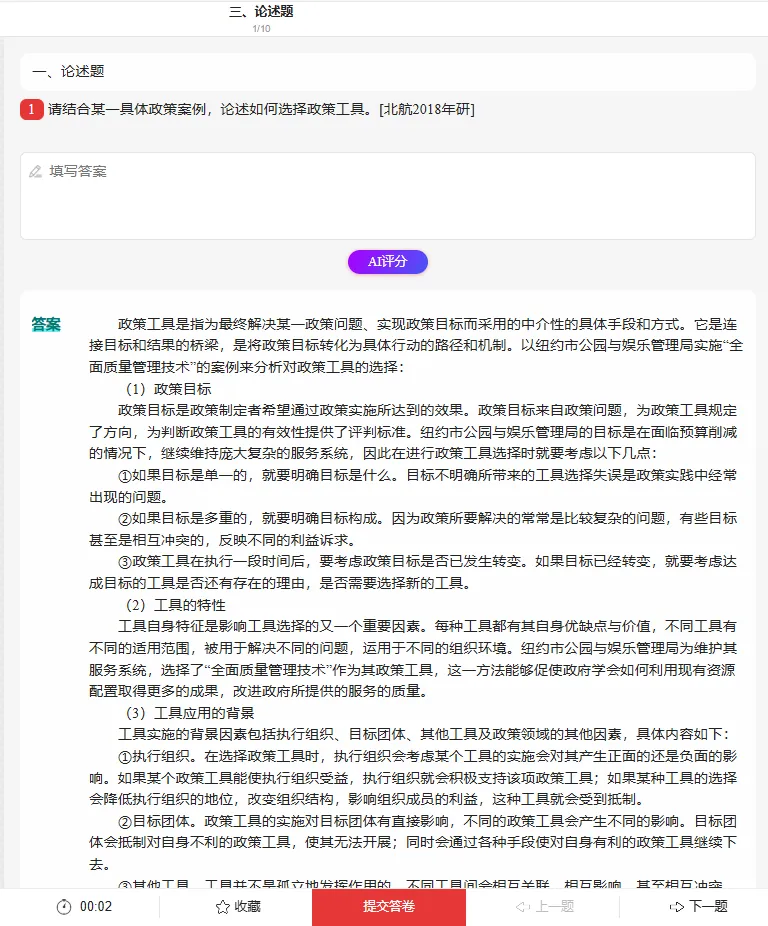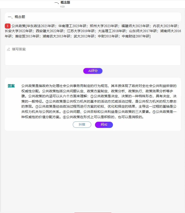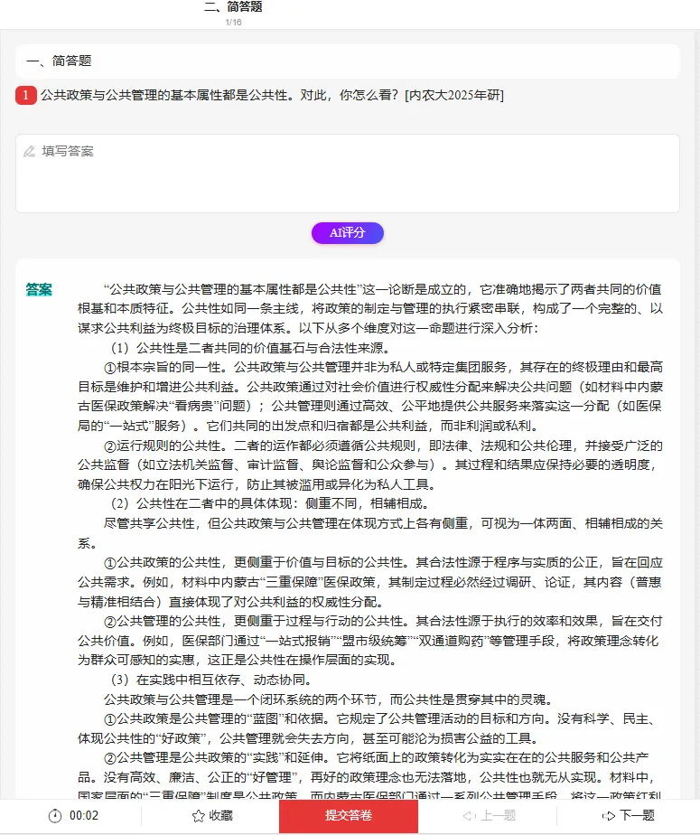 更绝的是 AI 辅助功能!遇到 “政策执行偏差原因” 这类难题,拍题就能获实时答疑;案例分析题写完,AI 还能评分指出漏点;错题自动收录,碎片时间就能复盘,比自己整理错题省 3 倍时间。三种做题模式随心切:基础期用练习模式打牢知识点,冲刺期用考试模式模拟实战,效率直接拉满。
