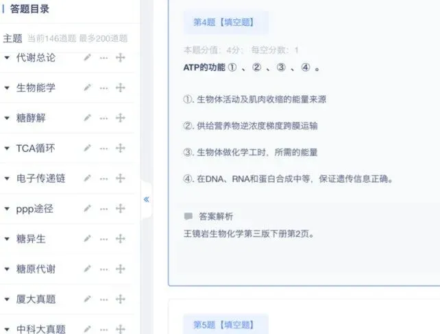 题库主要根据王镜岩生物化学第三版制作,很多解析精确到第几页,方便考生做题时查漏补缺。此外也有个别985高校考过的填空题按章节做了归纳,如图中所示。