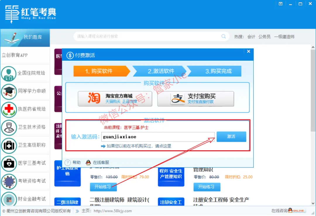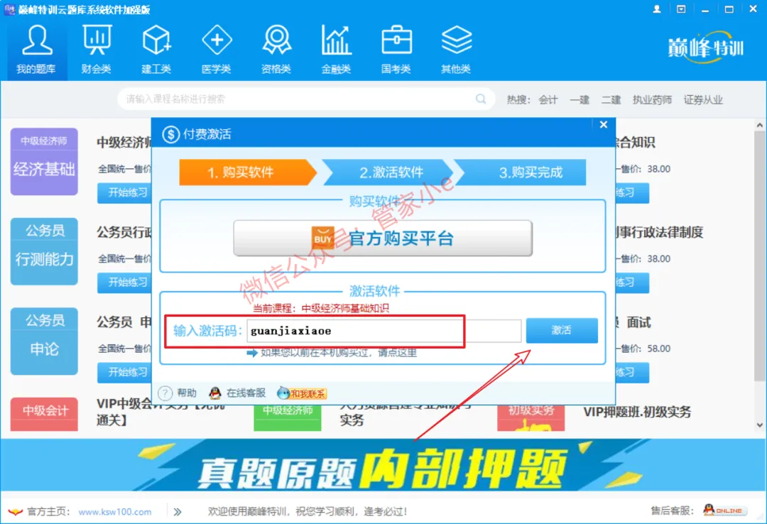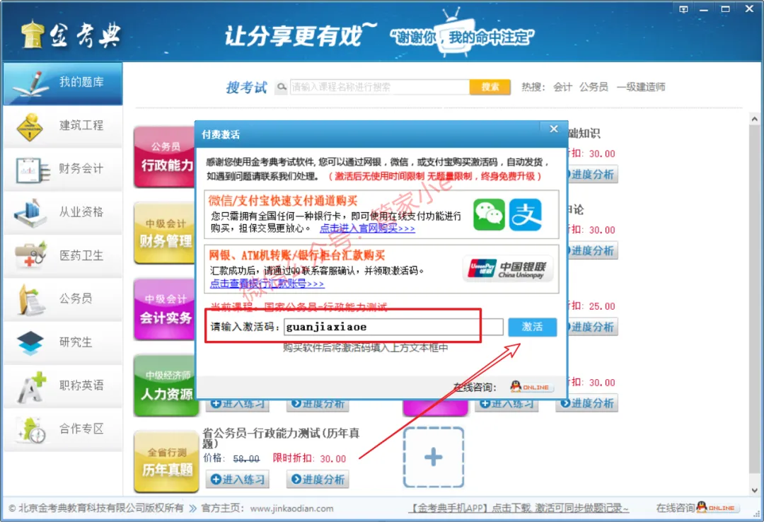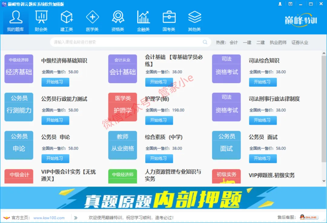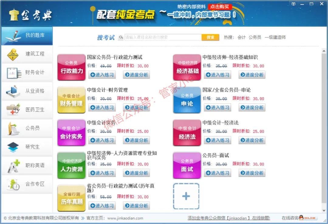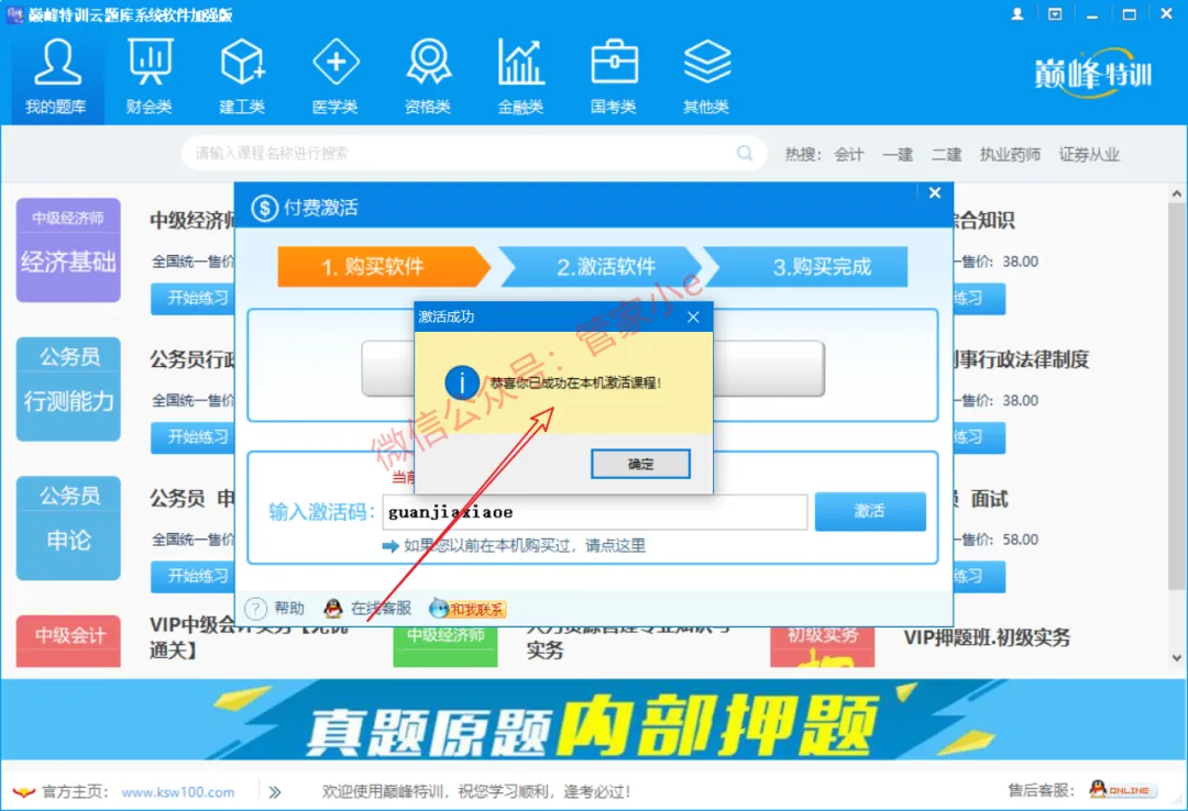 下图是金考典官网介绍的金考典软件拥有的各行业考证题库,非常多的科目。金考典提供简单的做题系统、按照全新考试大纲编辑,还有配套的章节习题,历年真题,预测模拟卷等等,非常适合备考2020-2021年执业考试的小伙伴们。官网给出的一门科目的价格表,每个科目都30,今天小e分享的全部科目统统免费,想学习哪个就学习哪个。题库软件也不需要安装,做题的时候运行如下程序即可。激活成功,如果弹出注册账号界面,点击取消,不用注册。