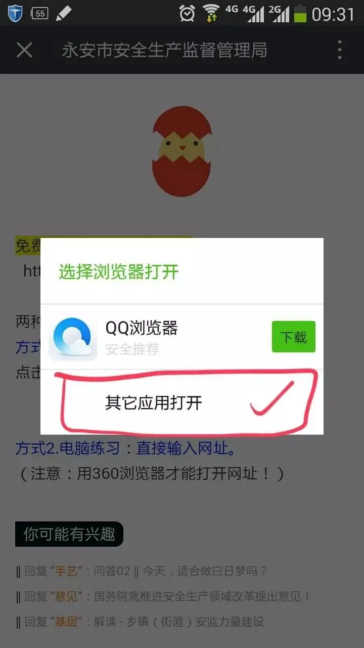 第二步,长按 机考题库网址,点击“在浏览器打开”