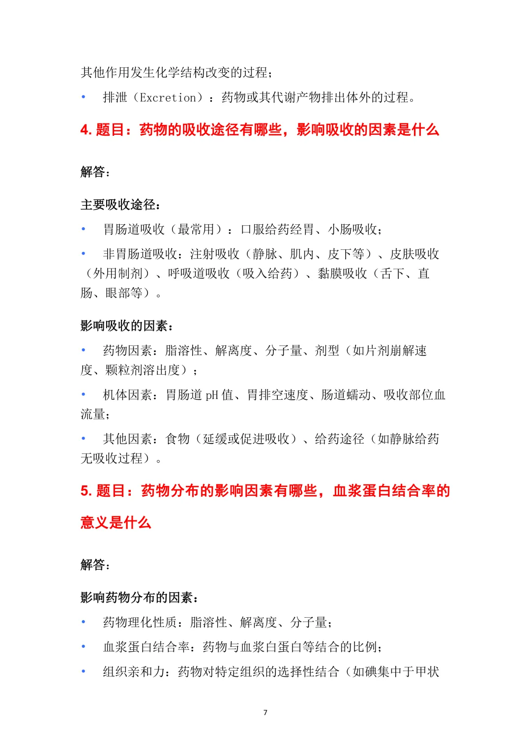 7. 题目:药物排泄的主要途径有哪些,影响排泄的因素是什么