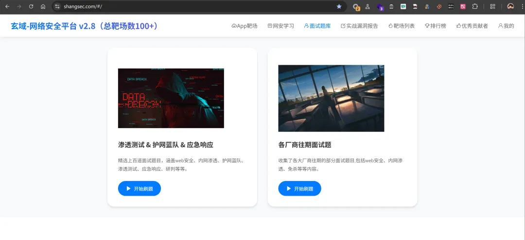 包括Web和App漏洞靶场、面试刷题板块、实战漏洞报告板块、网安学习板块等等。