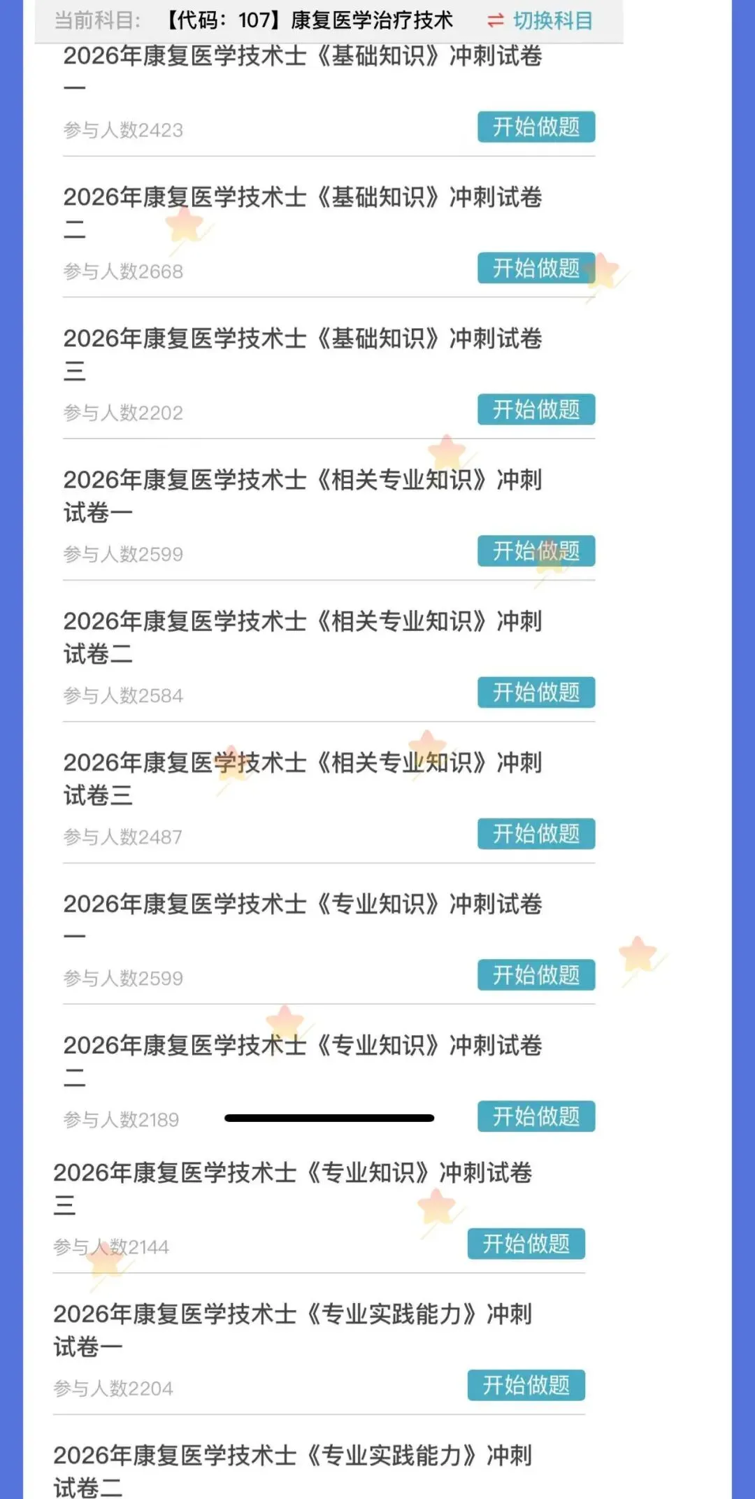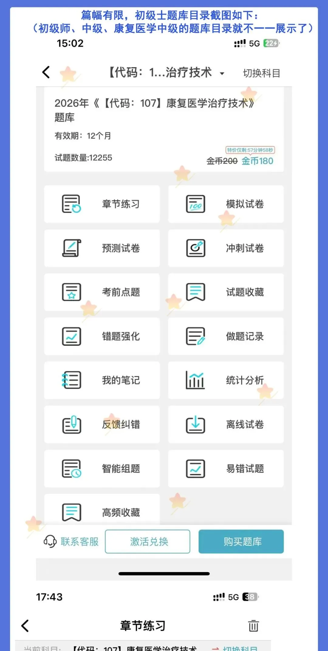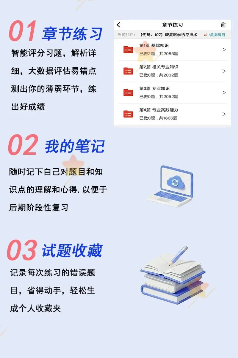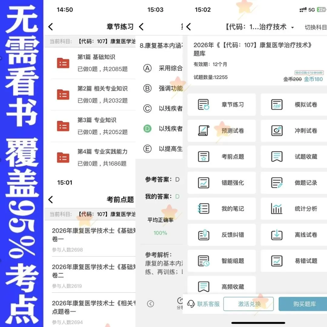 题库是考试的刚需,只要参加考试就需要多刷题,题库是必不可少的,题库的考试专业代码级别如下:2026年《【代码:107】康复医学治疗技术(士)》题库 原价180元 限时优惠价19元