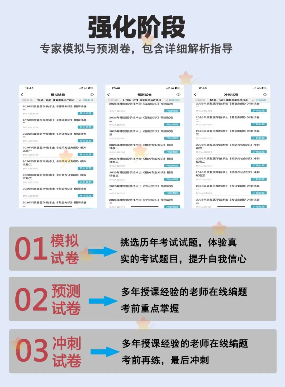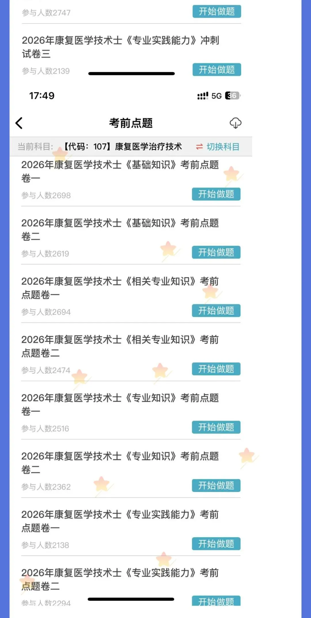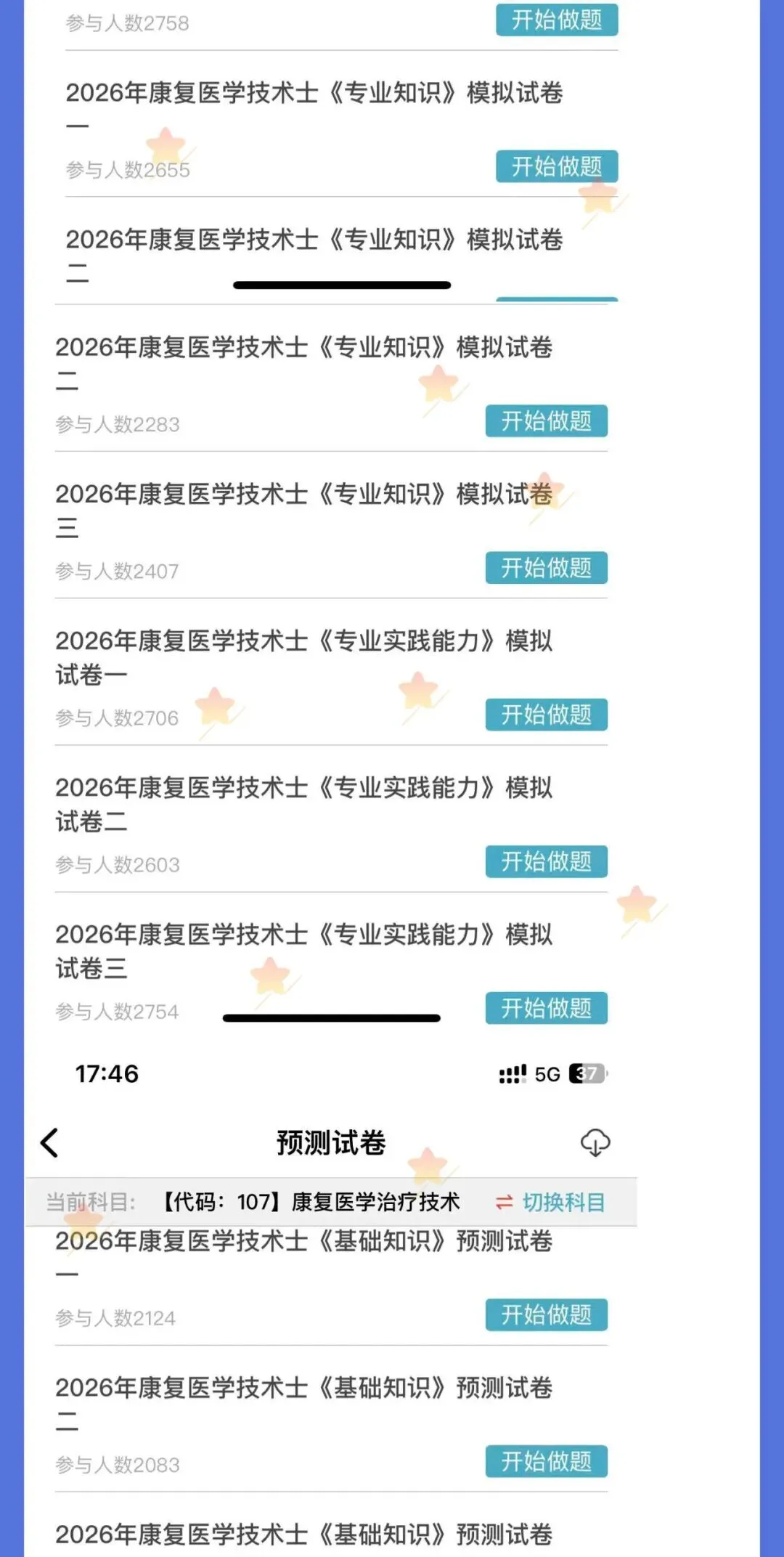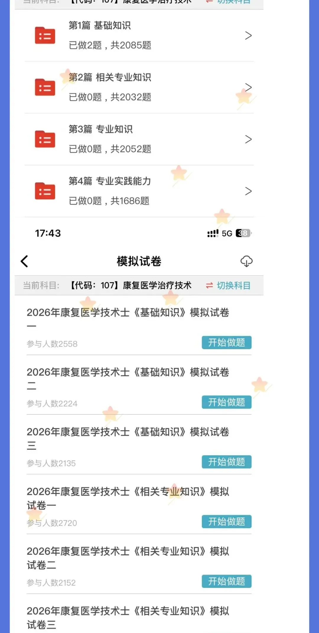 题库是考试的刚需,只要参加考试就需要多刷题,题库是必不可少的,题库的考试专业代码级别如下:2026年《【代码:107】康复医学治疗技术(士)》题库 原价180元 限时优惠价19元
