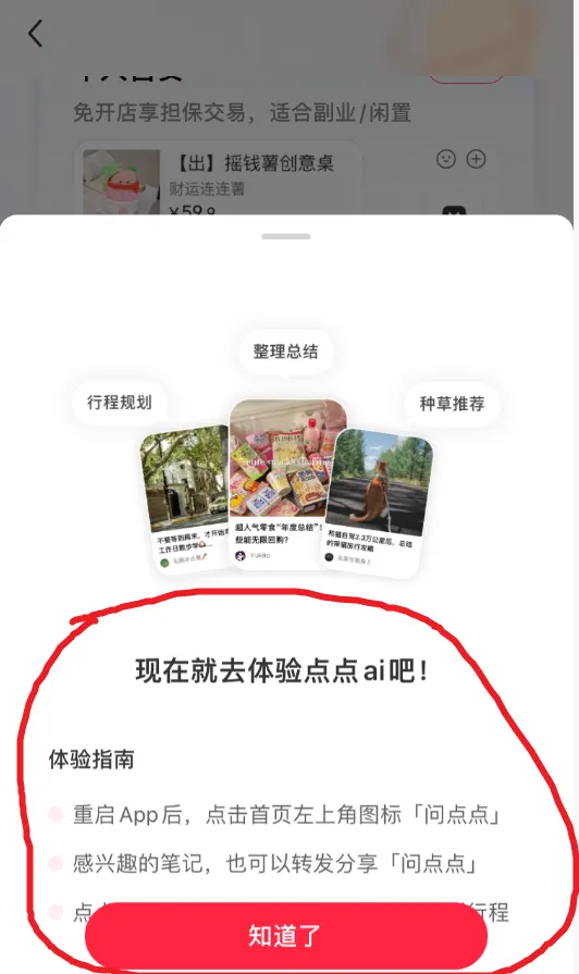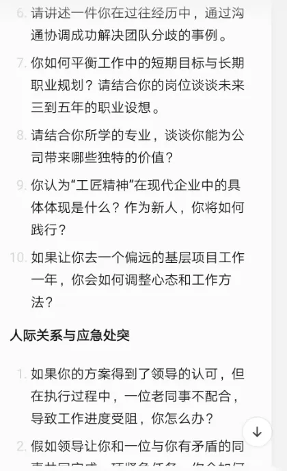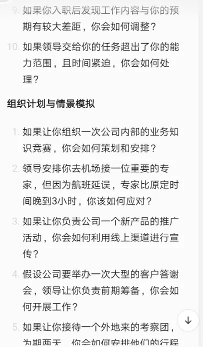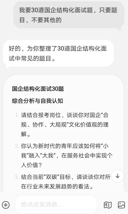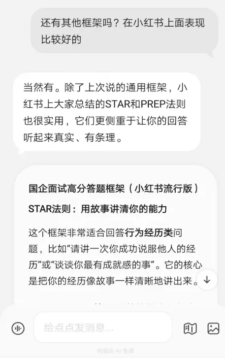 如果你开通不了,你直接下载一个点点APP也是可以的。4、开始生成内容,比如我们要做的是国企结构化面试题库。我们可以问:我要30道国企结构化面试题,只要题目,不要其他的。因为调用的是小红书数据,AI 出的这些问题,也是符合小红书的,有不少优势。我们可以问:我要国企结构化面试,单个面试题的整体框架提示词:还有其他框架吗?在小红书上面表现比较好的。有了框架和题目,我们随便找一个AI就可以了,然后提问让AI回答就行。七、做成 AI 原创题库