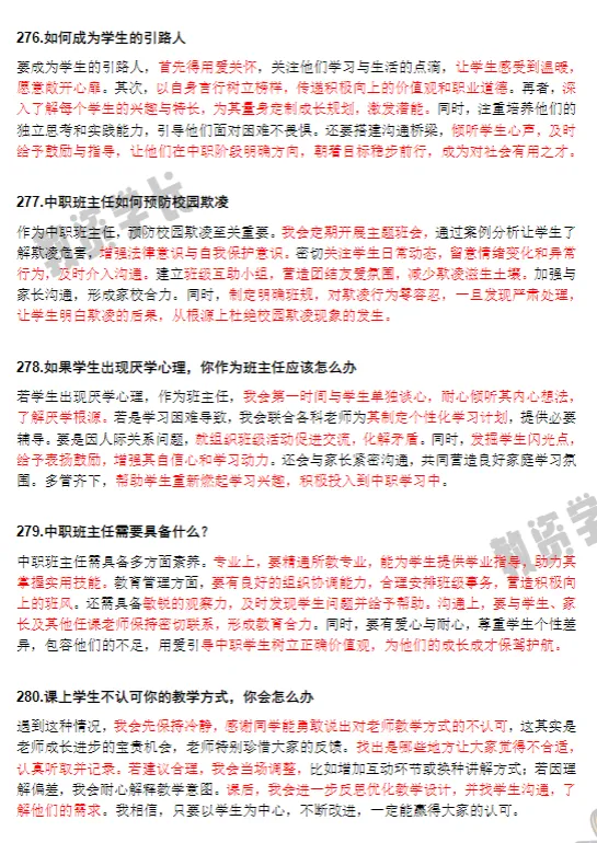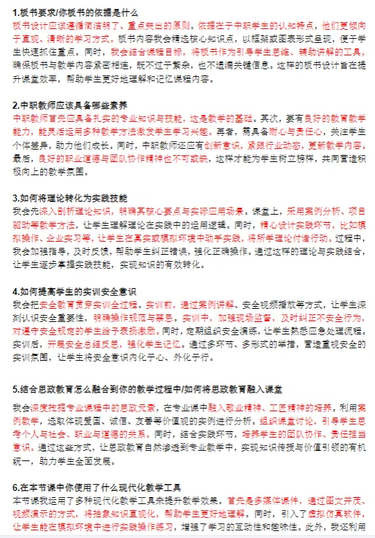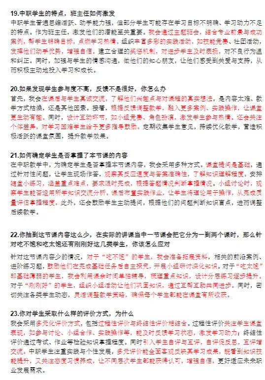 答辩完全由考官自主提问时可能问试讲的、问专业基础知识的、问类似结构化的问题的,因为中职有300多个专业,所以没有收录专业基础知识问题,主要收录了理论通用性问题!