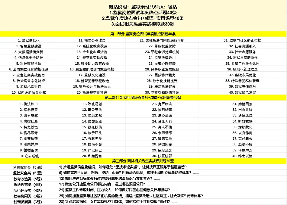 紧扣监狱工作核心,聚焦科技赋能、监管安全、教育改造、执法规范等 7 大必考热点,全覆盖无遗漏,完全匹配面试命题方向,备考不做无用功。