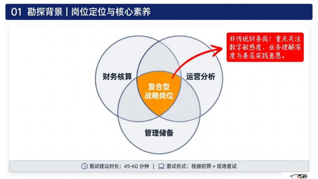 提问目的: 判断候选人对岗位的了解程度和真实诉求。是冲着稳定工作来的,还是对"财务+运营"的复合型发展路径有清晰认知。