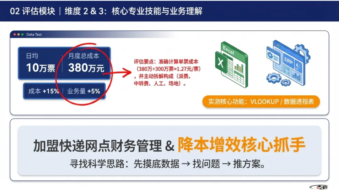 评估要点: 是否能准确计算单票成本(380 万÷300 万票≈1.27 元/票);是否能主动拆解成本构成(派费、中转费、人工、场地等);分析思路是否清晰有层次。