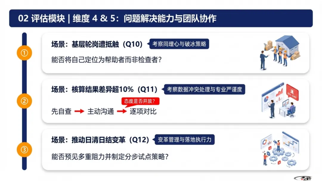 | 推动"月底集中"到"日清日结"的变革,预计阻力和推进方式? | | | 5分: 能预见多重阻力+有分步策略+考虑配套制度 3分: 认识到困难但方案不完整 1分: 对变革管理缺乏概念 | |