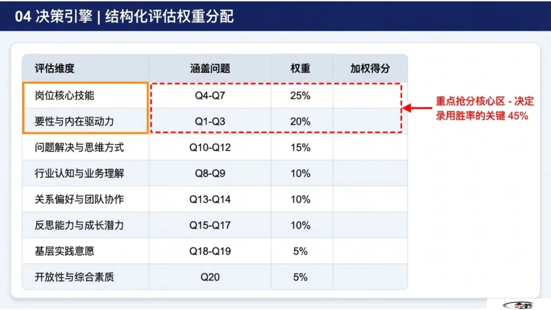 | | | | 5分: 决策逻辑清晰,提及 1-2 个关键人物并合理描述角色 3分: 能说出取舍但逻辑不够清晰 1分: 无法举例或描述混乱 | 核心观察:是否提及他人及提及方式(完全不提/过度感性/清晰理性) |