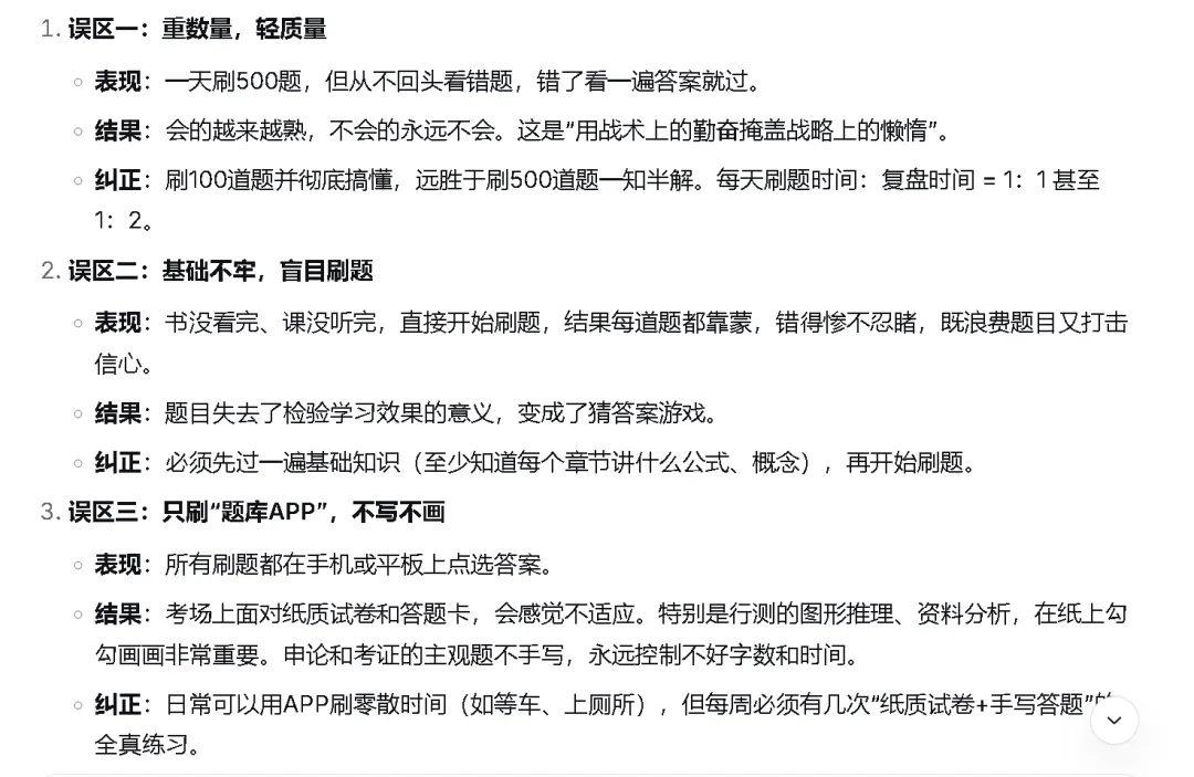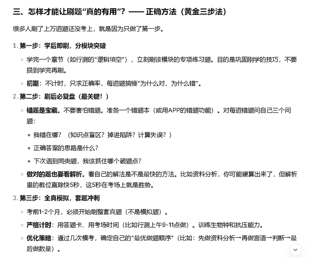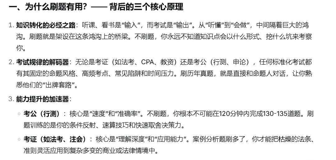 整个题研组在忙着出押题模考试卷之余,一位同事突然提起,他春节回家,在庙前请了圣杯,说咱们公司的经营会变动调整,果然,公司在年后就开始计划调整了。其他同事问还请了啥?他说今年咱们会很忙!我们真的很忙!因为今年将更聚焦题库和笔记两类项目,同时增加 社工证考试、公务员考试等的题库。我好奇心起,如果问问AI,考证考公刷题库有用吗?他会怎么说?于是在DeepSeek(DS)和千问里都里问了一个问题:刷题非常有用,是不可或缺的一环,但作用有明确的边界。在详细解释中,分别从从原理、具体作用、正确方法以及常见误区四个方面进行阐述。原理很简单,但每一条都很有分量:考试是知识转化输出、考试是“熟悉套路”、考试是提升“速度”和“准确率”。在作用方面,DS进一步区分了在考公和考证两种考试类别下的不同:这里,在《行测》科目的刷题,DS给出的更有分量的判断:绝对有用,甚至决定生死。在《申论》科目,建议反复刷“真题小题”和“大作文”。总结起来,常见误区就是:重数量轻质量,没有“回头看”;没有基础,盲目刷题;没有提前模拟真实考试场景,导致不适应不习惯。第一步,学后即刷题 。可对应海派辅考题库的“章节练习”。通过章节练习,可进一步巩固学习内容。第二步,刷后必复盘。可对应海派辅考题库中的“试题收藏”和“错题记录”和“错题强化训练”。无论是主动收藏试题还是错题的自动收入,都试题复盘的助攻MVP。第三步,必须参与全真模拟。电子考试中,可对应海派辅考题库的“模拟考试”。纸质考试中,同学们可自行下载打印模拟考试试卷。在千问里,它也给出了基本一致的回答。因为是PDF格式,同学们可以通过文末的“阅读原文”进行下载。海派辅考题库,满足上述黄金三步法所需的功能,不仅如此,还提供更多功能细节,主要表现在:1、考试分析。同学们完成模拟考试后,系统自动评分或者学员自主评分等方式,会自动分析总得分值、各题型得分率、正确率等,也包括各个考查知识点、教材章节等的得分率。通过这些指标,可以清晰反映同学们在各题型、考点、教材等应试能力和掌握程度。2、适合不同基础的同学备考使用。从扎实的备考策略来说,零基础的同学可从教材章节题库开始刷题,而专业毕业多年的职场人,可从考纲考点题库开始刷题,认知知识储备水平。从临场应急备考策略来说,通过分析历年考试频次,把握和预测重点学习的章节和考点。
