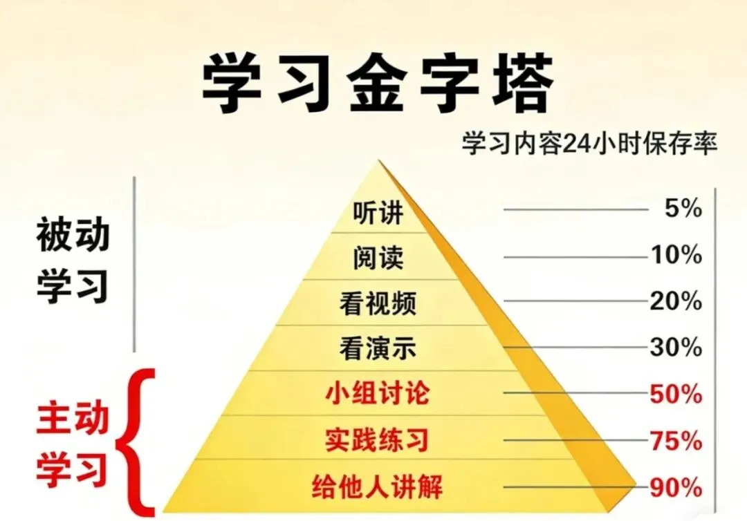 美国学者埃德加·戴尔提出的学习金字塔给出了答案:听讲留存率仅5%,阅读留存率10%,视听结合留存率20%——这些都属于被动学习,两周后几乎忘光。而讨论(50%)、实践(75%)、教授他人(90%)才是主动学习,效果翻倍甚至十几倍。