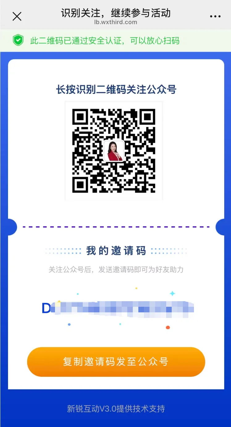 第三步:将专属海报发送给朋友,朋友通过扫描海报上二维码,会弹出下方页面,长按复制邀请码,扫描下方页面上的二维码,关注公众号并发送邀请码。