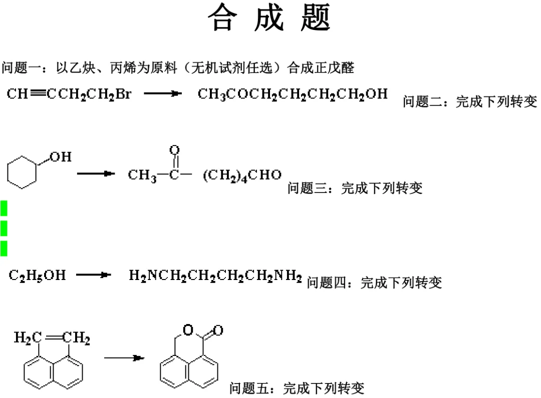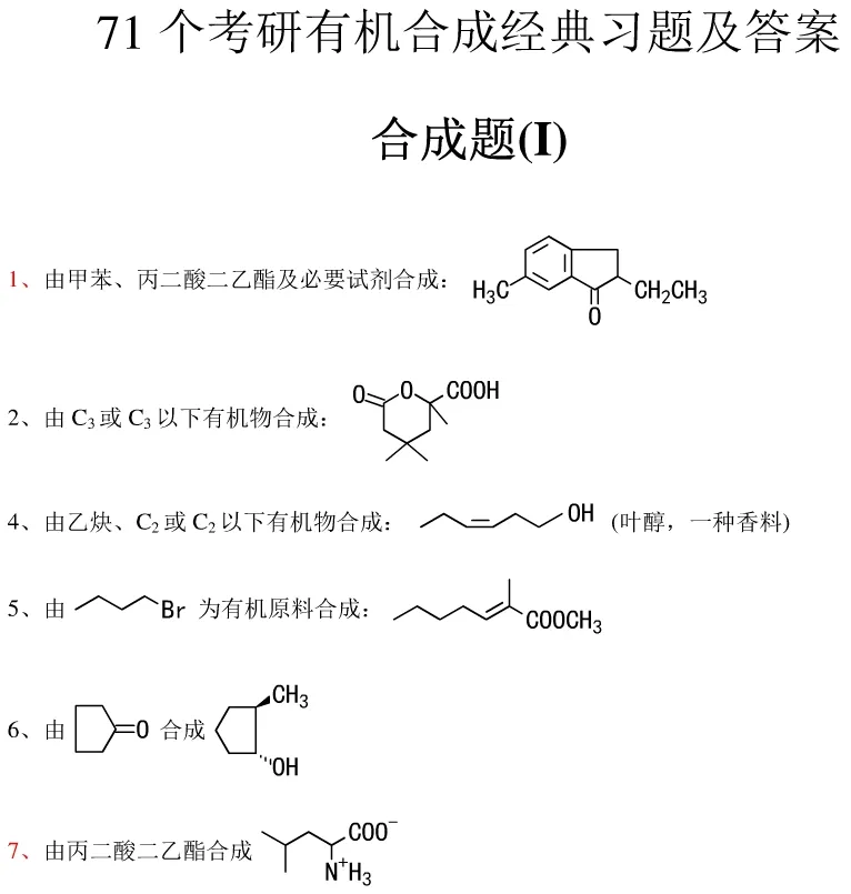 有机合成题作为考研必考题型,也是占比最大、分值最高的题型。合成题也是与别人拉开差距的重要题型,是前期所学知识的一个应用。总之,你的有机能不能考好,很大部分就在合成题这里。因此需要在平时多做多练,将相关反应练习熟练,培养做合成的思维,才能在合成题这块拿到比较好的分数。将现汇总了相关的有机合成题的一些题库,供大家练习。