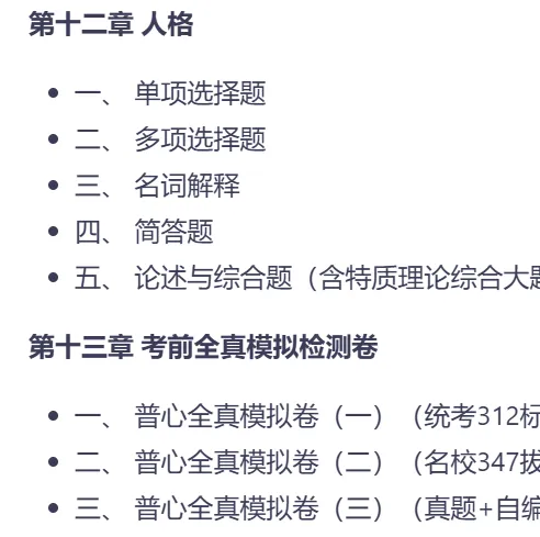 涵盖普通心理学(含导论)、社会心理学、教育心理学、发展心理学、实验心理学、心理统计和心理测量学全部核心科目。